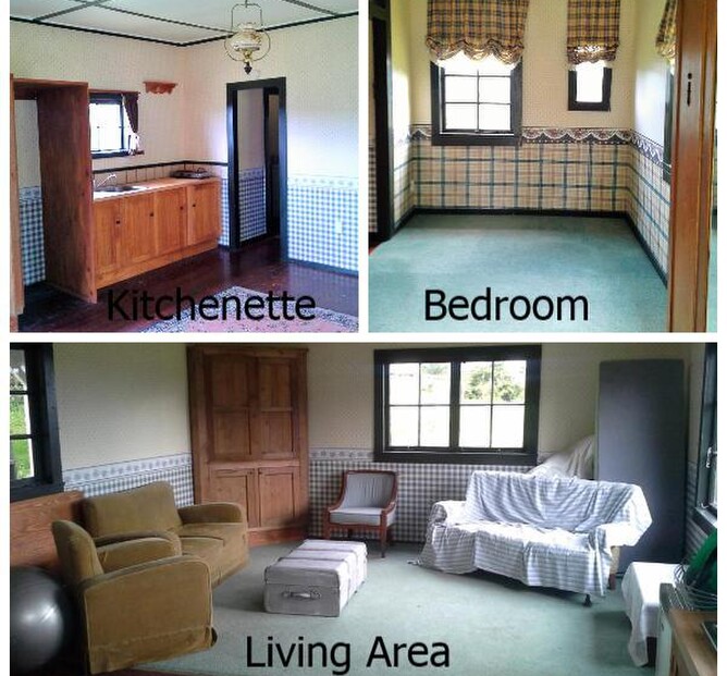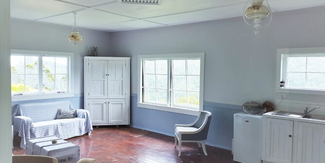 Once the exteriors of both cottages had a quick makeover, the focus was firmly set on the Orchard Cottage interior and you can get the idea from the photos below of the previous look, colour scheme and detail that has since been replaced. The Cottage originally started life as the Whangarei Croquet Clubrooms and was transported to this site by the previous owners. Positioned perfectly to enjoy the view over the orchard, the valley beyond and to bask in the warm afternoon sun.