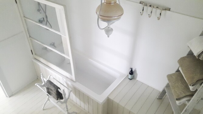 When it came to the screen door on the shower over bath, I was inspired by the many different ways people have used old windows. In fact I've realised I definitely have a thing for lovely old windows and I'm sure if we had more storage I'd probably pick them up like little stray puppies, dusting them off only to wonder what to do with them next!
