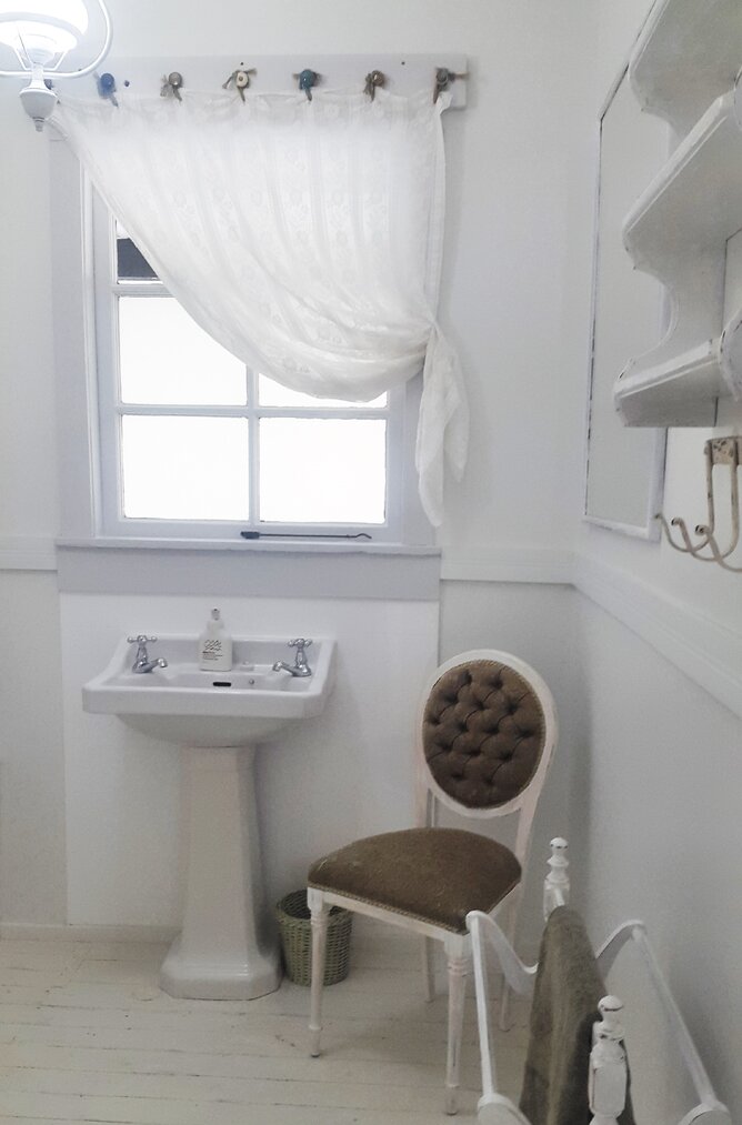 The bathroom often gets special mention and recently we've even had a number of our men guests showing a particular interest in the styling, details have obviously caught their eye and they want to know more. The window opens straight on to the large veranda so creating privacy with some interest was the goal. Different door knobs were attached to a roughly painted timber board, then we looped burlap ties through holes in the top of the fabric and tied them on to the knobs. When not fully down, the curtain is just swept to one side over a small coat hook. I also added some opaque window covering on the bottom few panes to increase privacy while not affecting the light.