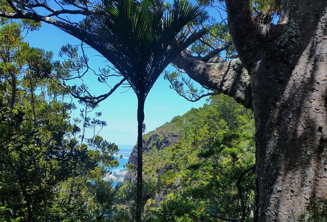 The winding track is well worn and being the height of summer I expected to be sharing the path with a number of others, but we only meet a few fellow walkers heading in the opposite direction both on our journey up and back down. The bush and bird song are simply beautiful, some impressive Kauri line the path and my favourite Nikau seem to frame the views around every corner.