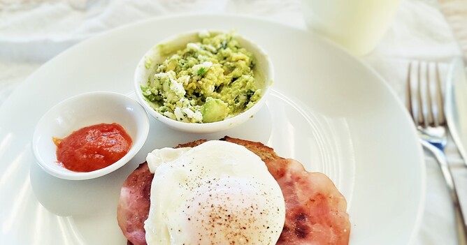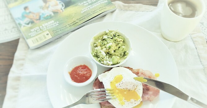 Poached egg on Vogels toast, with a slither of shaved ham. Avocado and feta smashed with a squeeze of lemon and a dollop of the deliciously spicy 'Harrief' on the side. This capsicum dip is rich with cumin, garlic and chilli and makes the perfect accompaniment to the soft egg, avocado and sharp feta.