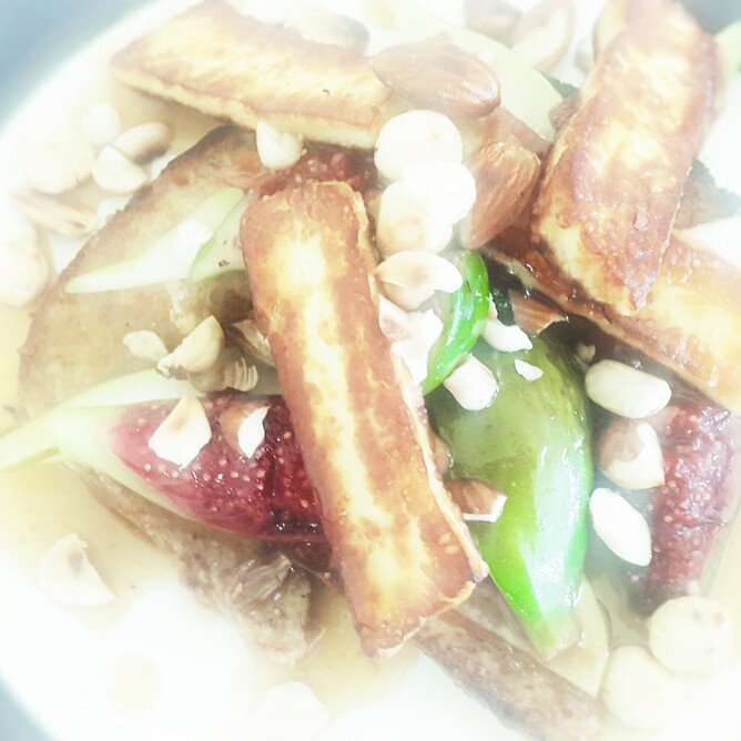 Fresh figs gently grilled, crispy fried Grinning Gecko halloumi cheese, thin slices of pear, toasted hazelnuts and almonds finished with a dressing of Kare manuka honey, Evergreen lemon infused olive oil and Due North tamarillo vinegar. We piled this on top of a piece of Vogels toast which mopped up the sweet and savoury juices perfectly.
