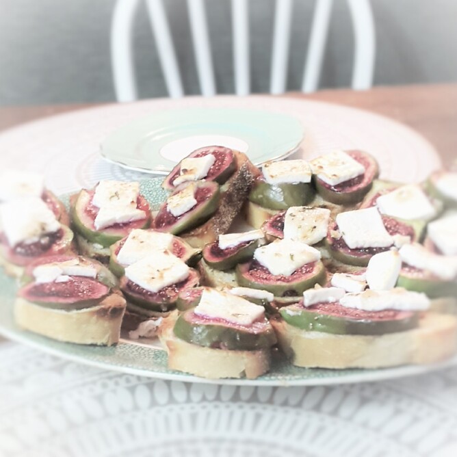 Crostini made from baguette, lightly toasted with a garlic and rosemary infused olive oil. Fresh figs sliced and topped with sliced goats feta then drizzled with the remaining infused olive oil containing an added glug of Due North tamarillo vinegar. Grill until the goats cheese is slightly caramalised.