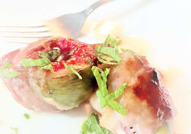Figs, halved, wrapped in a local streaky smoked bacon and popped under the grill until crispy (about 5 minutes). Drizzled with a tangy syrup of Kare manuka honey, orange juice and Evergreen lemon infused olive oil. Then sprinkled with chopped fresh mint. The combination is truly delightful.