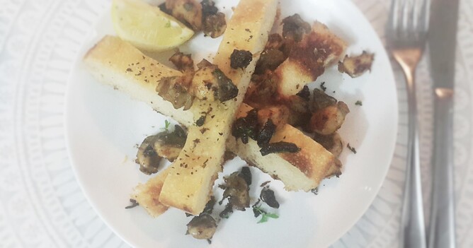 We served this with some local flat bread from our wonderful local deli / bakery The Med, simply sliced with it's Italian herb and olive oil goodness. A squeeze of lemon completes this finger-licking entrée!