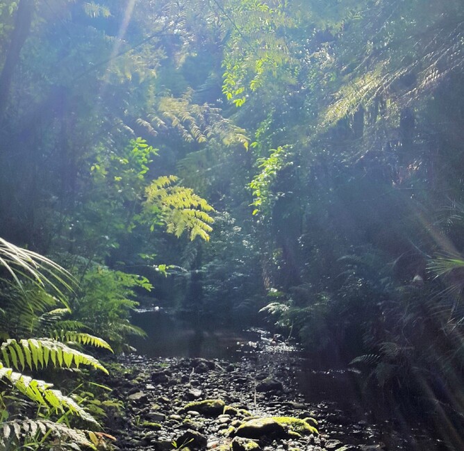 The stream meanders through, shallow and pebbly then opening up to deeper pools, then faster waters letting go through narrow channels creating little waterfalls. For as long as we walk beautiful rays of sun gleam through the forest canopy. Glistening off the water and lighting up the myriad of greens.
