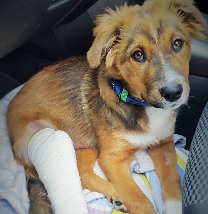 And this is despite the fact that for an SPCA rescue pup, he's actually cost us a pretty penny. It was a freak accident, in fact hardly even an event, just a little jump while playing with Holly that sent him screaming and yelping like I'd never heard before. Limping and then crying in my arms on a Friday afternoon, we had no idea what had happened. So it was down with the paint brushes and off on a speedy trip to the vet. An X-ray soon revealed a tiny but potentially devastating break in the growth plate of his hind knee. Specialised surgery was required followed by almost 6 weeks of the leg bound in a splint.