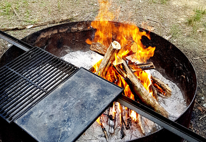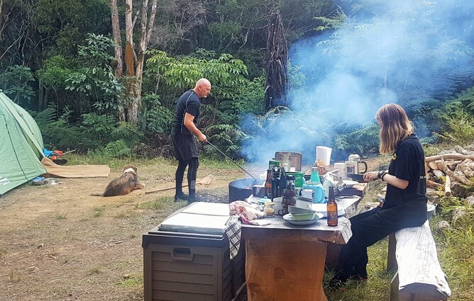 That evening we cooked dinner on the open fire, and as the sun sunk behind the trees we chatted and played scrabble. The campsite served us well, dining at the big Macrocarpa table with bench seat that was hand-crafted over a year ago with exactly this venture in mind, and a large outdoor box that doubles as a seat housed our chilly bin and kitchen essentials.