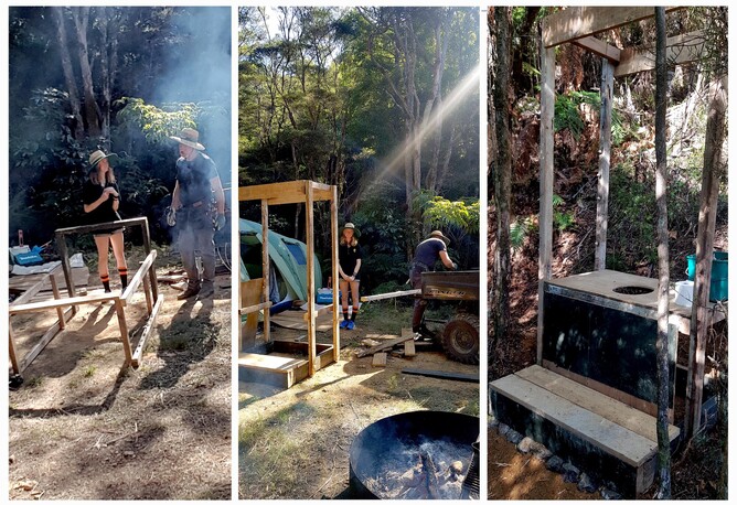 The treetop view is great, beneath the Nikau and Punga, the rocky bottom stream flows so it makes for a very 'Zen' spot to do your business! The following day, some old building materials were used for adding sides and a roof to complete the structure.