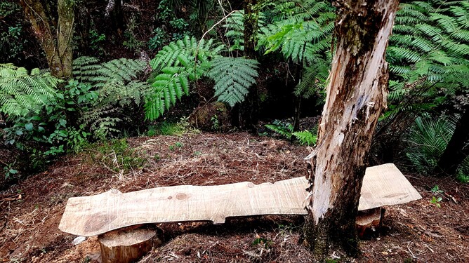 The next mission for this lovely little spot was to cut a new track and and pop in a new pew, that overlooks the stream and gets full water feature acoustics simply because of it's position. Perched into the side of the newly cut track, the seat was one of the easier tasks we took on, a couple of tree-stumps and a slab of Macrocarpa fitted perfectly into place.