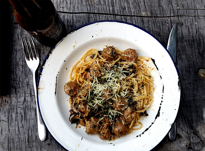 Dinner that night was served on some vintage enamel plates that I'd collected at op shops over the years, they've been down there waiting to be used for far too long and somehow made the mushroom and sausage meatball pasta dish taste richer and more delicious than it maybe should have. Of course, that could also have been due to the two days of physical activity and clean bush air!