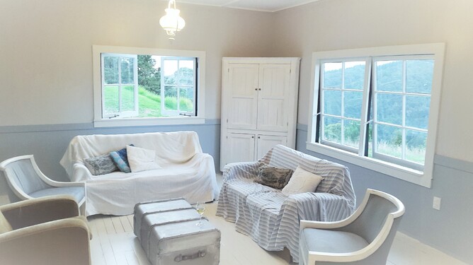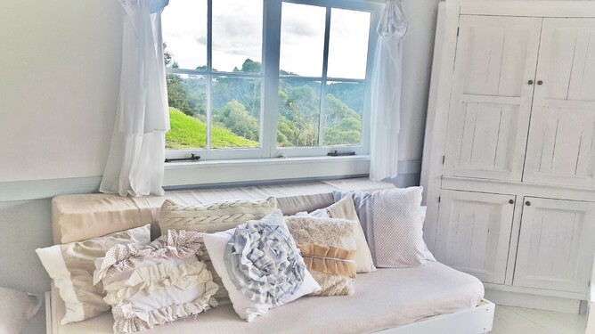 I always had a vision of daybeds in the lounge, with plenty of cushions and extra cosy blankets on hand for those afternoon naps that are a rite of passage when you're enjoying a retreat from the world. They were obviously meant to be as we discovered some solid hand-crafted bunk beds in the little bush hut that sits amongst the trees part way down our bush track. Once dismantled to get them out the door and transport them up to the Cottage, we realised we had two unique and perfectly good daybed bases. Just a few minor adjustments by our resident handyman, a light slap of the trusted white undercoat, and they were ready to receive good quality mattresses for sitting and sleeping comfort.